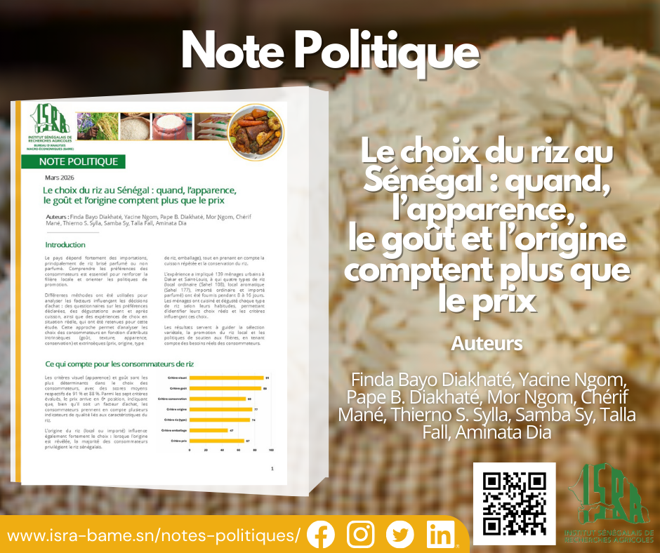 📄 Le prix n’est pas le seul déterminant de choix du type de riz pour les consommateurs Sénégalais. Leurs décisions sont influencées par l’apparence avant cuisson, le goût et l’origine du riz. Voici une nouvelle une Note Politique qui montre la nécessité d’investir dans la chaîne de transformation, afin de garantir la propreté, l’homogénéité des riz locaux et l’emballage.